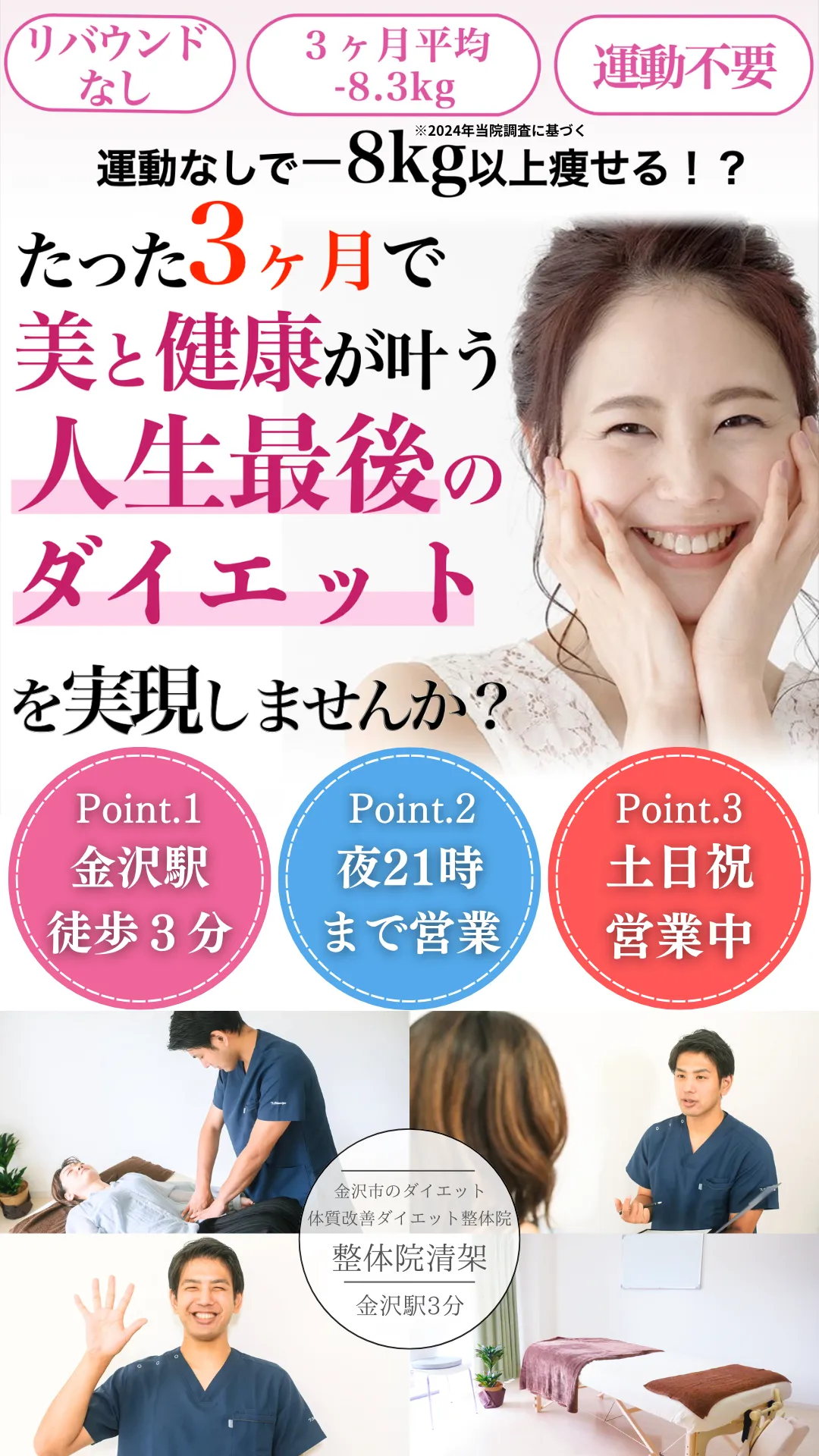 初回のカウンセリングなどを踏まえダイエット計画をお話させていただき、ご納得いただいてからダイエットコースの施術を行なっていきます!当院の人生最後のダイエットコースを「ぜひやってみたい!」思っていただいた方のみのご案内となりますので、お気軽にお越しください。